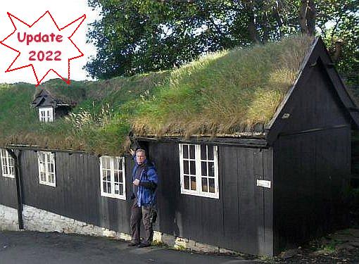 ... seit 1979 Haus in der Altstadt von Tórshavn: Schwarz geteert, mit Grassoden gedeckt. Davor der Autor dieser Seiten