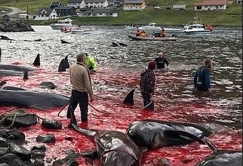 der Anblick von im blutroten Wasser treibenden Kadavern von Walen oder auch Delfinen ein schockierender Anblick!
