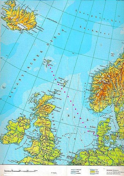 Ganz oben links auf der Europakarte fanden wir Island, darunter weiter rechts die Färöer und noch weiter nach rechts unten die Shetlandinseln.